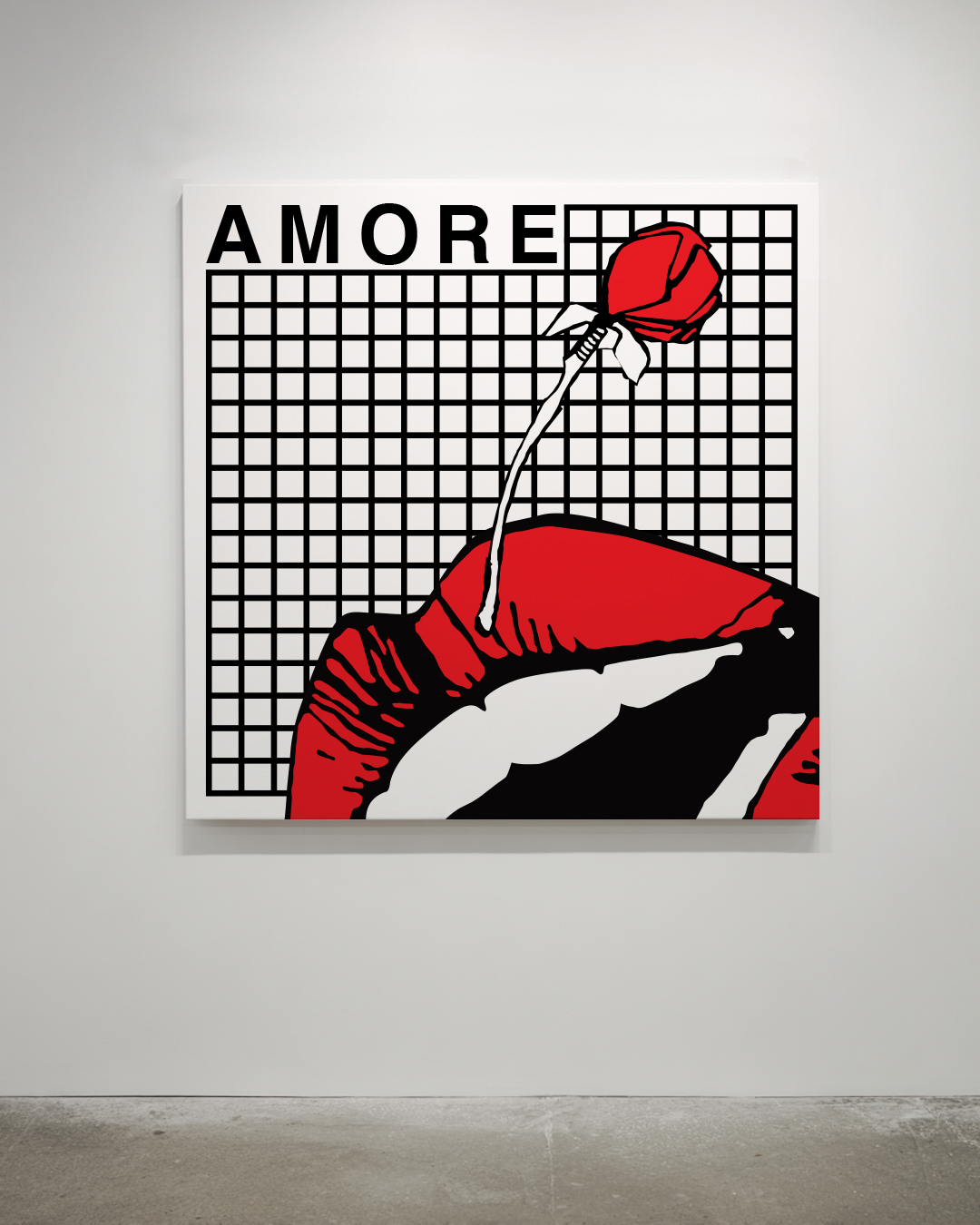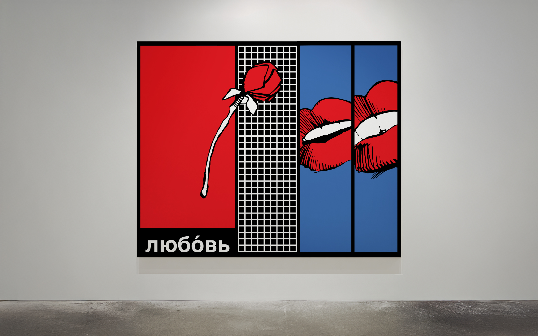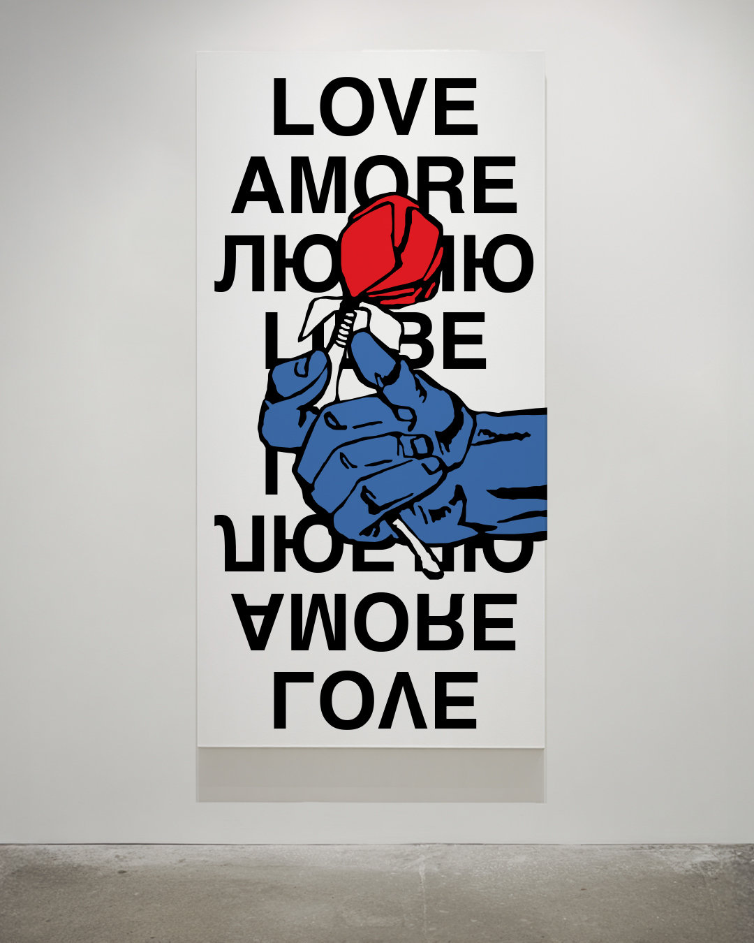 My works juxtapose vibrant blocks of red, blue, and black with graphic grids and enlarged details of lips and roses — timeless symbols of affection reframed in a modernist composition. Typography in multiple languages (Amore, Liebe, Love, Любовь) emphasizes love’s universality, yet also its reproducibility in a globalized culture.