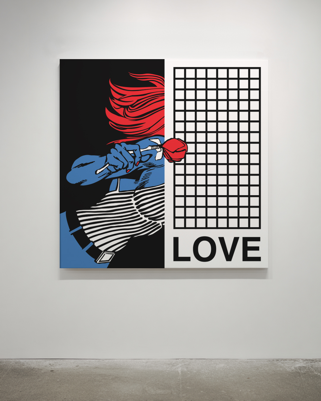 The paintings strike a balance between seduction and critique: their immediacy recalls advertising and comic book art, while their scale and materiality transform them into monumental meditations on intimacy and spectacle.