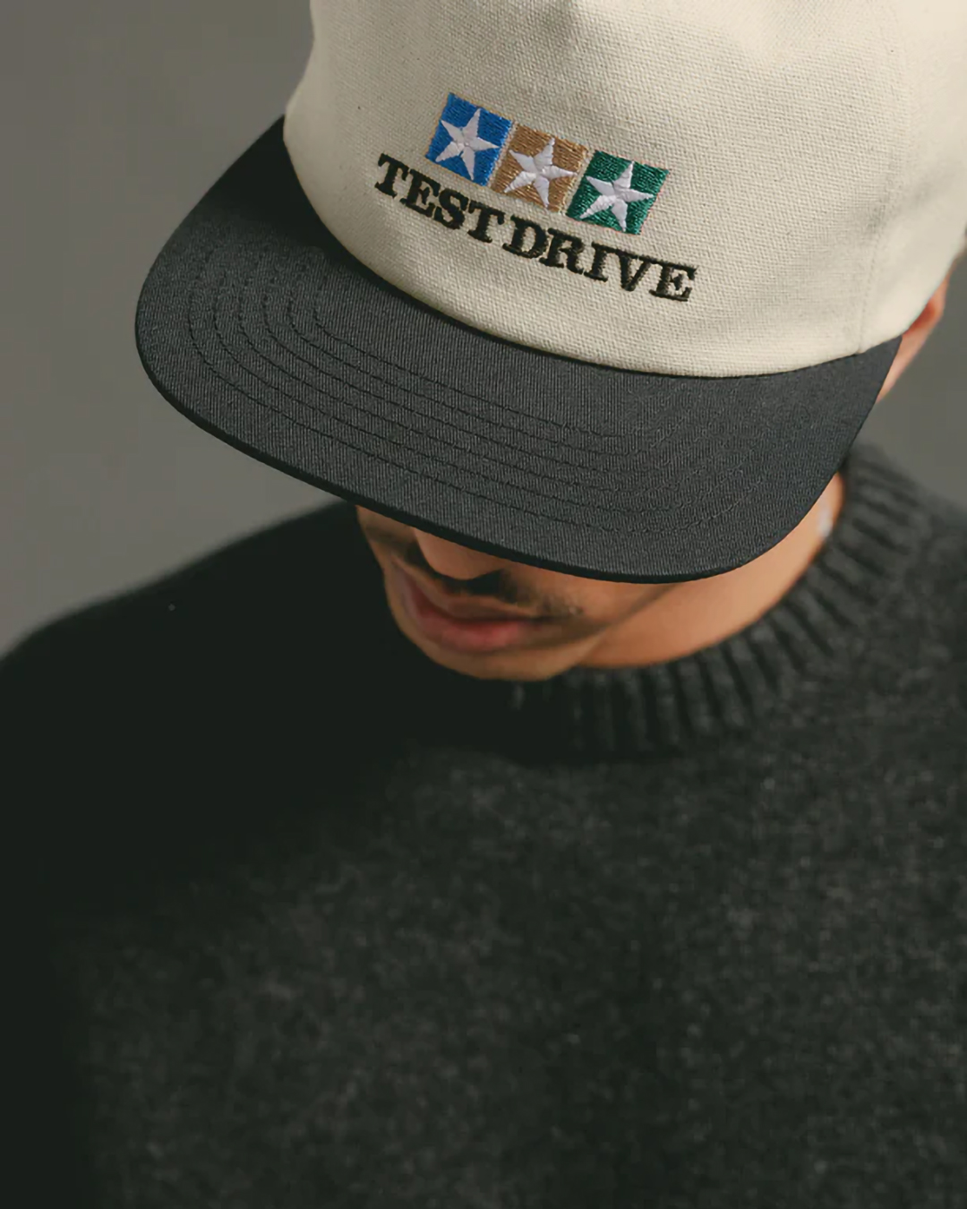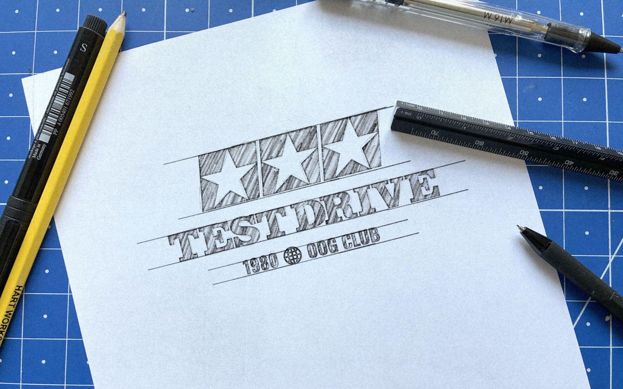 The design fuses bold geometry and nostalgic flair: three stars in angled panels recall vintage racing decals and 80s–90s hobby culture. Each color block – blue, gold, green – stands for motion, heritage, and exploration. The heavy “TEST DRIVE” type evokes muscle and confidence, while the globe mark below hints at global connection and shared journeys. It’s not just a logo – it’s a badge for modern petrolheads with a sense of humor and a hunger for the road.