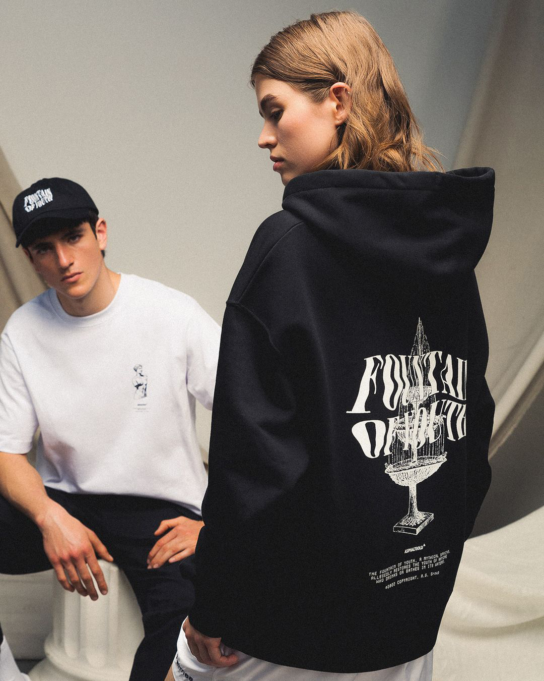 The Greek Myth Capsule for Asphaltgold translates ancient narratives into contemporary graphic expression. I designed a series of textiles that merge mythological symbolism with bold typographic treatments, creating visual tension between classical imagery and modern design language. Distorted letterforms like “Eternal Life” and “Fountain of Youth” evoke the timeless search for immortality, while clean serif typography on pieces such as “True Romance” adds contrast and clarity. By combining statuesque motifs with expressive type, the collection bridges myth, culture, and aesthetics in a distinctly modern way.