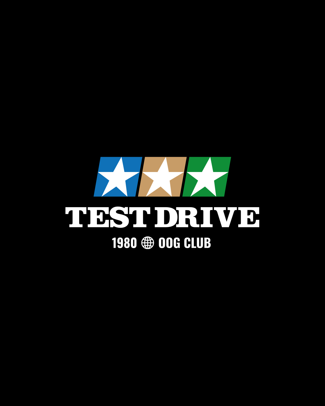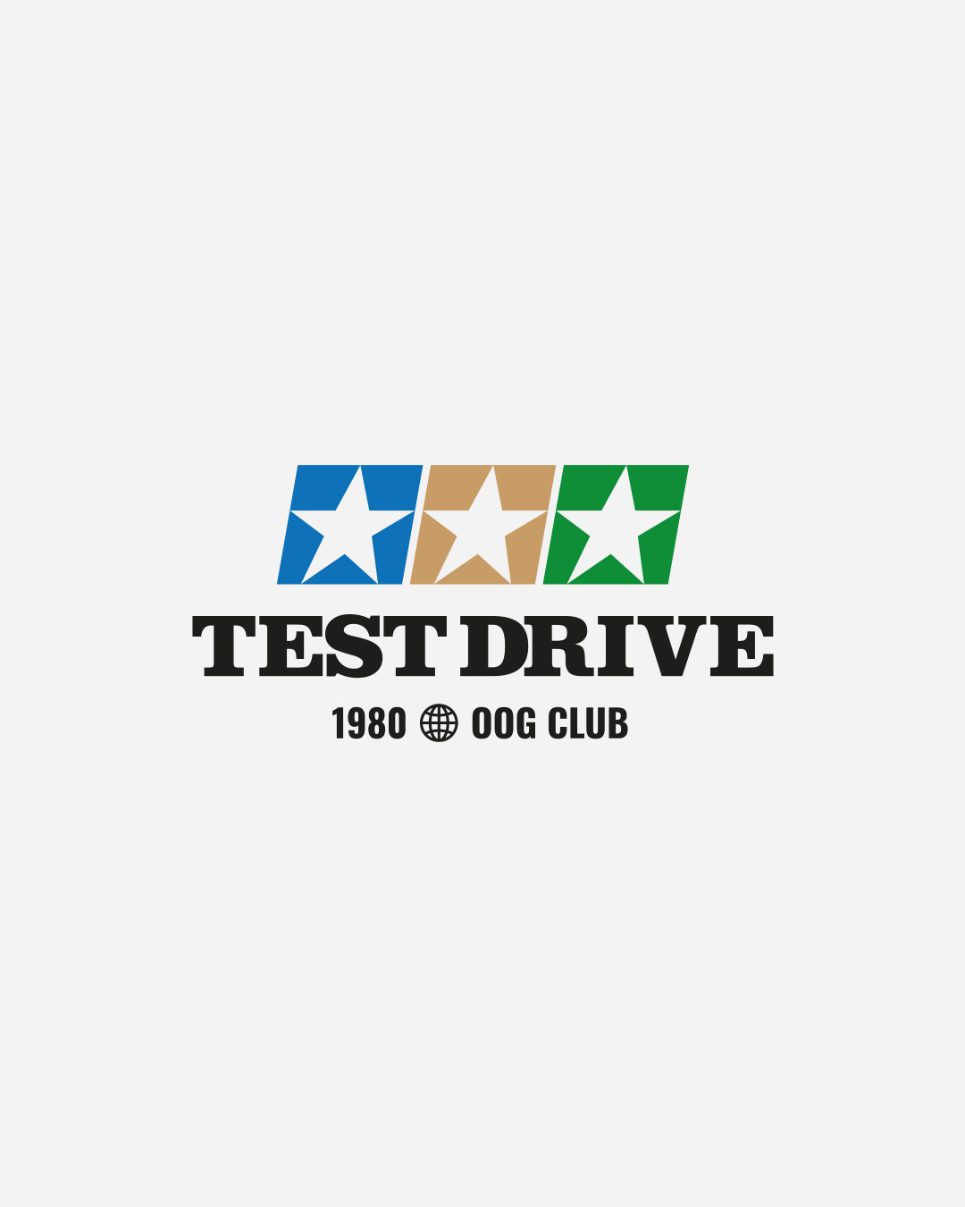The design fuses bold geometry and nostalgic flair: three stars in angled panels recall vintage racing decals and 80s–90s hobby culture. Each color block – blue, gold, green – stands for motion, heritage, and exploration. The heavy “TEST DRIVE” type evokes muscle and confidence, while the globe mark below hints at global connection and shared journeys. It’s not just a logo – it’s a badge for modern petrolheads with a sense of humor and a hunger for the road.
